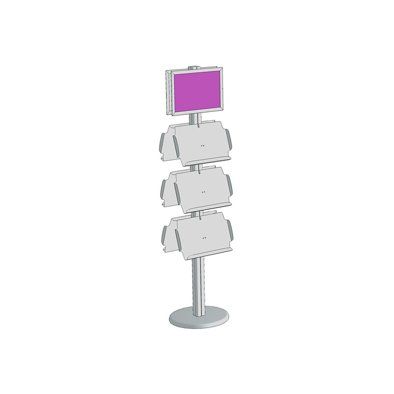 Sistema modular de gran robustez. Bases, mástiles, portafolletos. Disponible en diferentes configuraciones terminadas o por piezas sueltas.