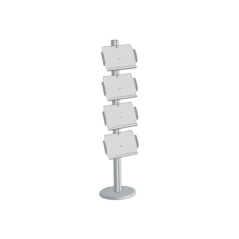 Sistema modular de gran robustez. Bases, mástiles, portafolletos. Disponible en diferentes configuraciones terminadas o por piezas sueltas.