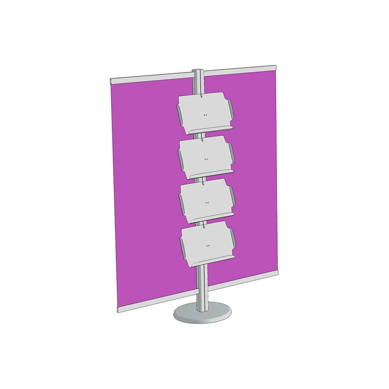 Sistema modular de gran robustez. Bases, mástiles, portafolletos. Disponible en diferentes configuraciones terminadas o por piezas sueltas.
